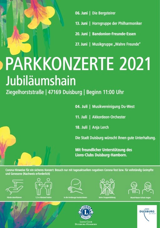 Nach einem gelungenen Auftakt am letzten Sonntag wird die Parkkonzertreihe im Jubiläumshain an der Ziegelhorststraße am Sonntag, 13.06.2021 um 11 Uhr, mit der Horngruppe der Duisburger Philharmoniker fortgesetzt.